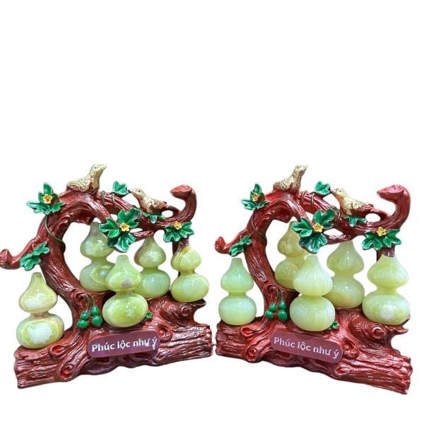 Chất liệu chính: Hồ lô từ đá ngọc onyx xanh tự nhiên, khung tạo hình từ nhựa tổng hợp giả gỗ, hoa lá sơn màu nổi bật, chim hỷ thước trên cành