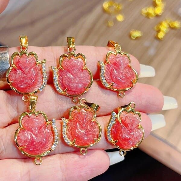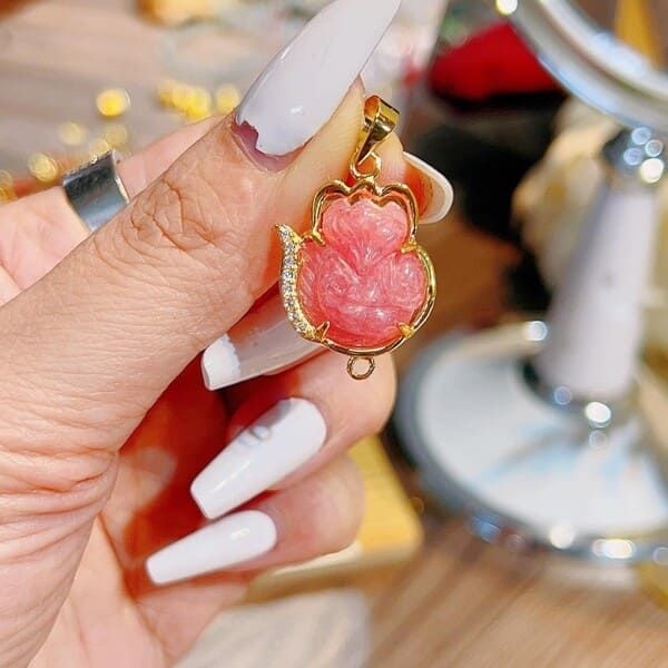 - Mặt Đeo Hồ Ly Đá Đào Hoa Bọc Vàng 10k có thể được đeo như một chiếc mặt dây chuyền trên dây chuyền hoặc vòng cổ.