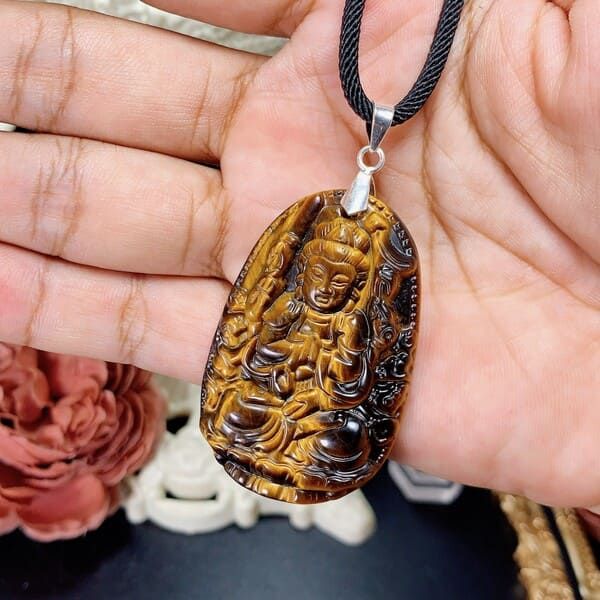 - Mặt Phật Bản Mệnh Mắt Hổ 45mm có thể được đeo như một chiếc mặt dây chuyền trên dây chuyền hoặc vòng cổ.