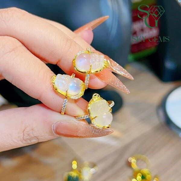 - Đá Mặt Trăng Moonstone: Mang vẻ đẹp thanh tao, tinh khiết, tượng trưng cho sự may mắn, bình an và sức khỏe. Đá Mặt Trăng còn được cho là có khả năng cân bằng cảm xúc, tăng cường trực giác và kích thích sáng tạo.