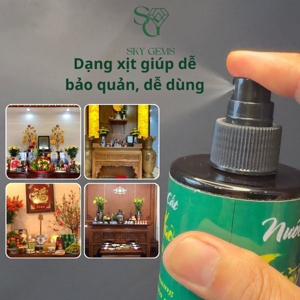 Xịt trực tiếp lên khăn mềm (không xịt trực tiếp lên tượng, gỗ, đồ thờ):