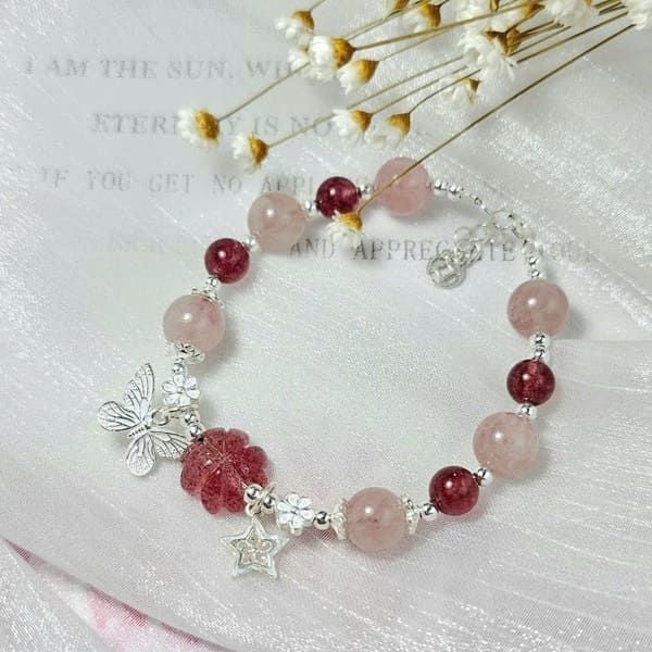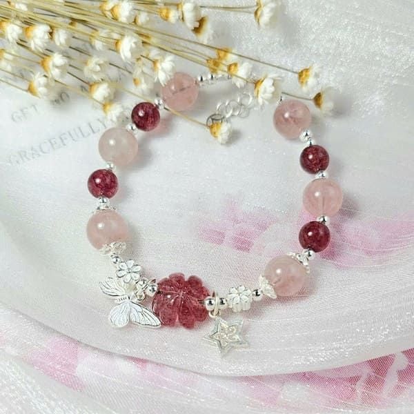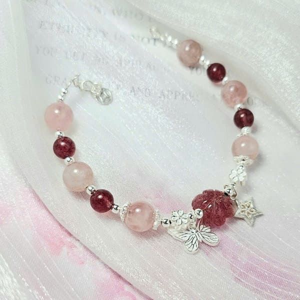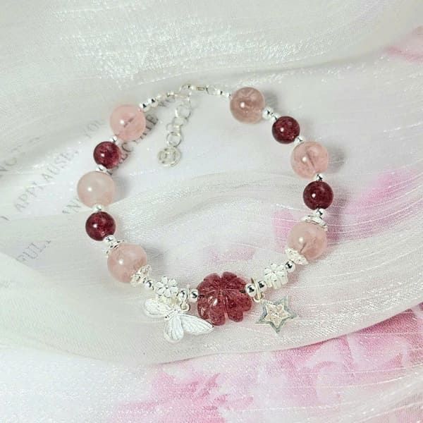 Tên sản phẩm: Vòng tay thạch anh dâu tây hồng mix thạch anh hồng và charm bạc