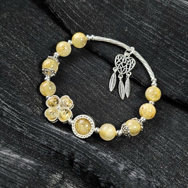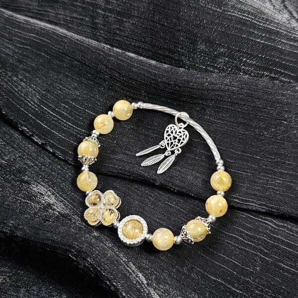 Vòng Tay Cỏ 4 Lá Thạch Anh Tóc Vàng Mix Charm Bạc là sự kết hợp hoàn hảo giữa vẻ đẹp tinh tế của cỏ 4 lá, năng lượng may mắn của Thạch Anh Tóc Vàng và sự sang trọng của Charm Bạc.