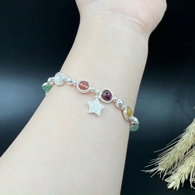 - Chất liệu: Đá quý tự nhiên (Thạch anh, Amethyst, Citrine, Garnet, ...) mix charm bạc 925