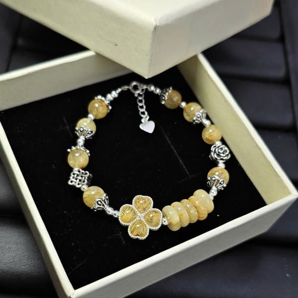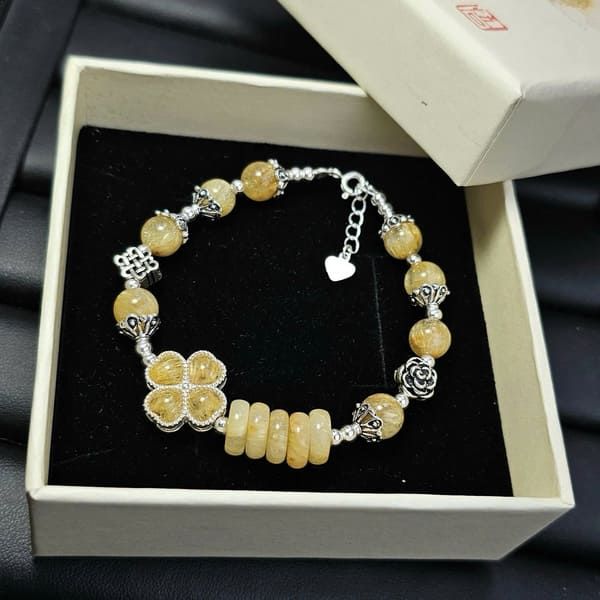 Vòng Thạch Anh Tóc Vàng Mix Cỏ 4 Lá Bọc Bạc & Ngũ Điếu – Kích Hoạt Tài Lộc, Tăng Cường May Mắn